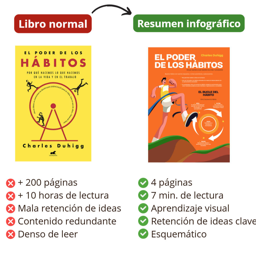 | 📈Velocidad aprendizaje | Avance lento, dependes de tu ritmo de lectura | Aprendes lo esencial de muchos libros en poco tiempo |
