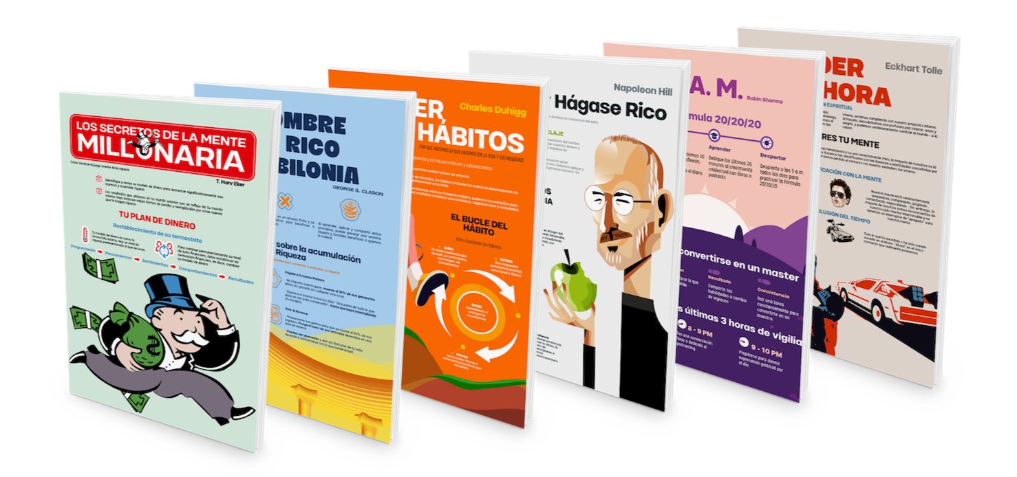 ➡️ Aprende rápido los conocimientos más valiosos, sin tener que leer ni comprar los libros completos. Además puedes aplicar los conceptos más transformadores rápidamente a tu vida diaria para ver resultados.➡️ Retén fácilmente las ideas clave, de los 62 Best Sellers más importantes sobre desarrollo personal y educación financiera gracias a la infografías.➡️ Ahorra dinero: Si tuvieses que comprar cada uno de los libros completos de este pack te costaría en torno a 1000$ en total, en cambio, con nuestro pack ahorras centenares de dólares/euros y aprendes lo conceptos clave igualmente, yendo al grano.➡️ Ahorra tiempo: Aprenderás las ideas más importantes de cada libro en a penas 7 minutos e forma resumida, visual y fácil de entender.📚 Puedes ver en detalle la lista de libros incluidos abajo